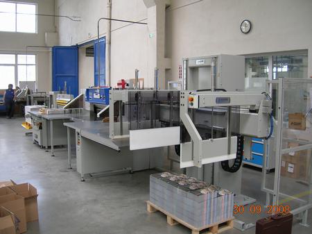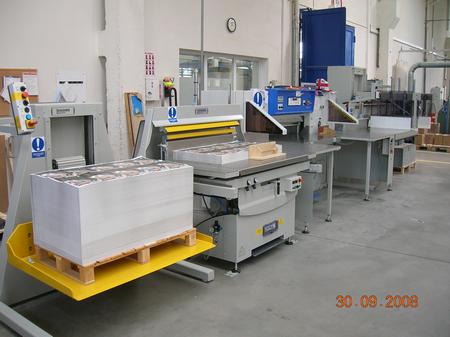Sestava řezací linky v přímém uspořádání s řezačkou papíru MAXIMA MS 115 BP a s periferním zařízením od firmy Knorr- Systeme instalovaná v září 2008.